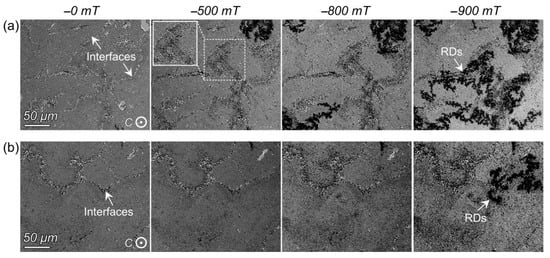 Dynamic magnetization reversal processes of the (a) WC-free magnet and (b) the WC-doped magnets. The spotty reversed domains are indicated by a frame in (a). The direction of applied magnetic field is out-of-plane. Reproduced with permission []. Copyright 2019, Elsevier.