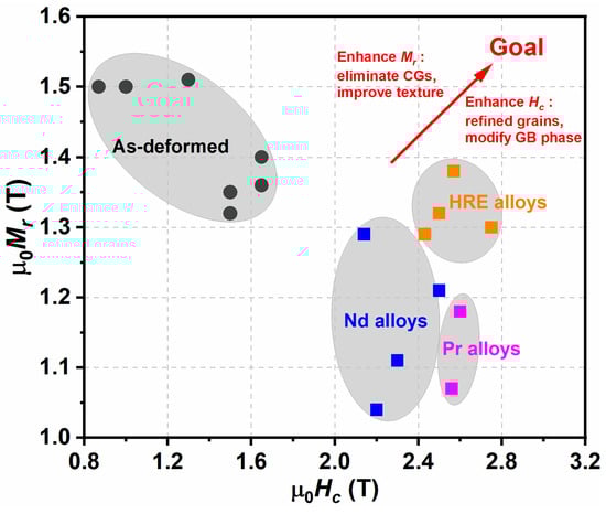 To completely meet the requirements for the traction motors of (hybrid) electric vehicles at working temperature ranges of 20–180 °C, the magnetic properties of permanent magnets including μ0Hc > 2.5 T, μ0Mr > 1.35 T and μ0Hc @180 °C > 0.8 T should be achieved []. Figure 28 shows a map of magnetic properties for the as-deformed magnets and diffusion-processed magnets by different types of alloys. It is clear that the HD magnets diffused by HRE-containing multielement alloys show superior magnetic properties and basically meet the needs of traction motors. According to the current understanding, the further enhancement of the magnetic properties for the HD magnets with lower HREs should modify their microstructure in the following aspects: (i) ultrafine grains and excellent grain alignment, (ii) eliminated CGs, (iii) uniform thin nonferromagnetic grain boundary phase and (iv) fully covered HRE-rich shells. For the HD magnets without HREs, the ideal microstructure and targeted magnetic properties cannot be easily realized only relying on the current GBDP and DADP, and the optimized diffusion processes or other new approaches should be explored for the wider application prospect of the HD Nd-Fe-B magnets.