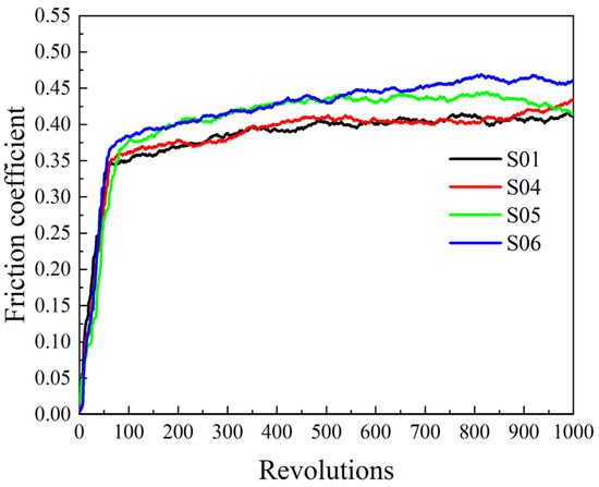 As the friction process progresses, the micro convex body is continuously sheared and peeled off to form abrasive debris, which is continuously compacted into a frictional film. The frictional film gradually grows and forms from scratch, and also constantly tears and damages under the shear action. At the initial stage of friction, the area of the film is unstable, so the friction coefficient also fluctuates greatly (Figure 3). After a period of friction, the formation speed and damage speed of the frictional film form a dynamic balance; so, the friction coefficient remains in a stable range.