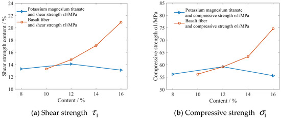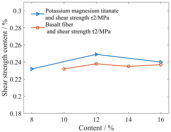 The shear strength measured by the method shown in Figure 1 was tested on six formula samples in Table 1, namely, friction materials with different basalt fiber content and potassium magnesium titanate content. The experimental results are shown in Figure 6. Figure 6 shows the influence curve of composition content on shear strength .