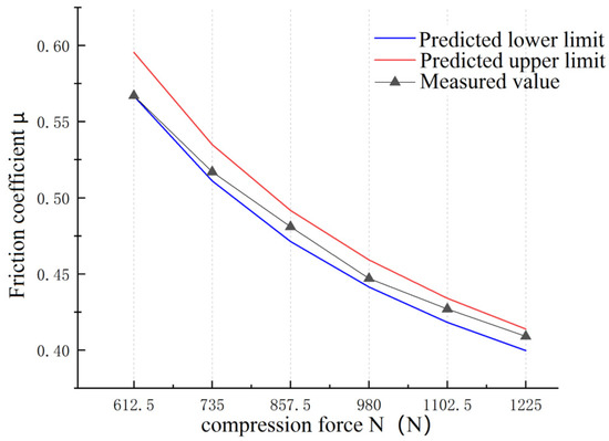 The contact load of the XD-MSN constant speed friction testing machine during friction and wear experiments can be adjusted by weights. The friction coefficient can be tested experimentally at the contact load of 1225 N, 1102.5 N, 980 N, 857.5 N, 735 N, and 612.5 N, respectively. The S01 sample was selected for this test. Because it is a sample with the same formula, the shear strength of the frictional film, the shear strength of the friction materials and the compressive strength are constants. They have been measured in Section 3.1 and Section 3.2. It can be seen from Section 4.4 that the wear morphology characterization parameter is equal to 0.712 for this formula. Moreover, according to Equation (8), it can be seen that the friction coefficient is inversely proportional to the contact load . The predicted value range and measured friction coefficient value of the friction materials are shown in Figure 9.