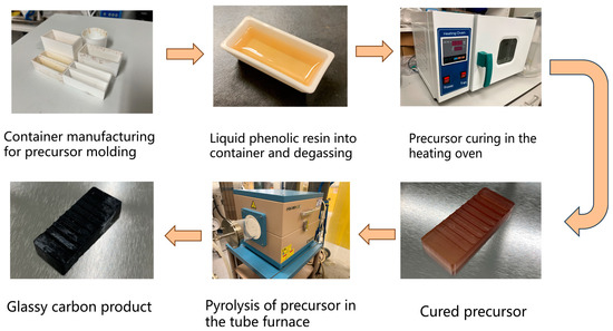The flowchart of GC fabrication is as shown in Figure 1. In this work phenol formaldehyde (PF) resin (obtained from Henan Borun Casting Materials Co., 93 Ltd., Gongyi, China), with a room-temperature viscosity of 16–19 Pa·s and a carbon mass content of 40–45%, was used as a bulk precursor for direct pyrolysis to produce glassy carbon. The resin can be cured in an incubator at 100 °C after being degassed in a low vacuum environment for 1 h. The curing time was varied from 6 to 22 h to examine its influence. The cured precursor was pyrolyzed in a tube furnace with an N2-purged atmosphere. In pyrolysis, a GC precursor is heated from room temperature to 1000 °C at a rate of 1 °C/min. In the heating process, we hold the temperatures at 300, 400, 500, 600, and 1000 °C for 60 min in order to drive away gaseous reaction products at different stages. After that, the pyrolyzed product is naturally cooled in the furnace.