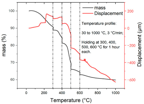 Pyrolysis induces volume and mass changes associated with internal structural evolution. Hancock et al. [30] measured the room-temperature density of GC precursors after pyrolyzing PF resins to various temperatures to infer the structural evolution. Here, we made an attempt to determine the in situ changes in volume, mass, and density during pyrolysis by using TMA and TGA, and the results are shown Figure 4. It can be observed that the pyrolysis resulted in a total decrease of 600 μm (21% of the original height) in the sample height and a total mass reduction of 40%. The sample height increased due to thermal expansion and decreased due to reactions. The quick increase in sample height associated with mass reduction in the temperature ranges of 140–150 and 210–220 °C were noted. At temperatures below 230 °C, a series of dehydration and condensation reactions occurred in the precursor, as described in [31]. The gaseous products escaped from the precursor leading to the formation of micropores. Our TMA and TGA results suggested that the reactions at 140–150 °C and 210–220 °C were radical, resulting in an obvious mass reduction but volume increase. From 220 to 300 °C and then during the one-hour dwelling at 300 °C, the sample height decreased, which corresponds to the pre-carbonization stage. We then observed another increase in the sample height from 300 to 400 °C, which should have been caused by thermal expansion and this expansion was associated with approximately 10% mass loss. This indicates that the pre-carbonized substance became more porous than the cured one in this temperature range. After 400 °C, the sample heigh only decreased and the fastest decrease occurred between 400–500 and then at 500 °C.