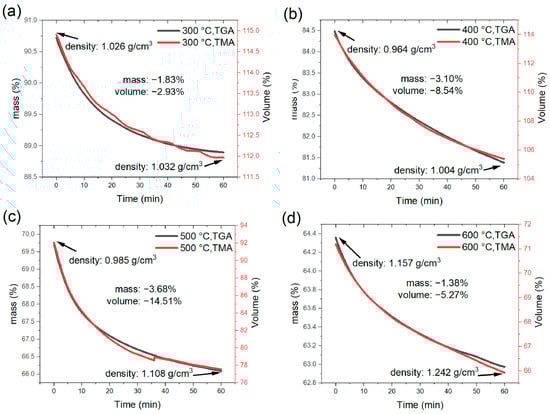 Volume, mass, and density changes at four holding temperatures: (a) 300 °C, (b) 400 °C, (c) 500 °C, and (d) 600 °C.