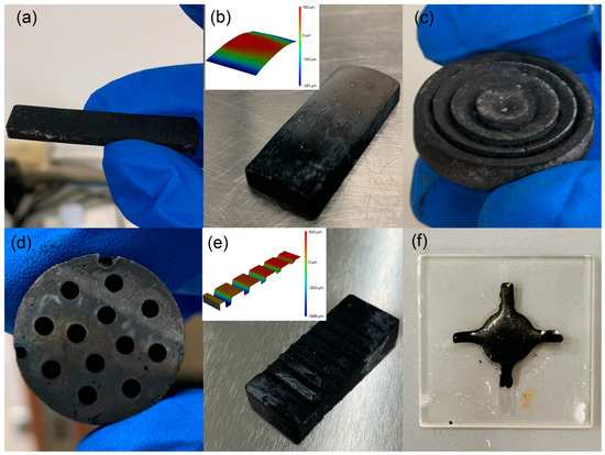 GC prototypes with various geometries: (a) a rectangular bar for IET testing, (b) curved surface, (c) Fresnel lens mold, (d) honeycomb, (e) surface gratings, and (f) a cross on a silica slide.