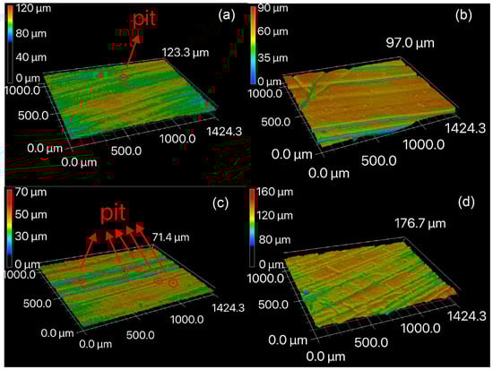 GC prototypes with various geometries were fabricated using the method described in Section 2.1. The reliability of this preparation method is demonstrated in Figure 6, wherein different GC products are shown. In particular, the prototype shown in Figure 6a was prepared for subsequent IET tests. To examine the surface morphology and roughness of the GC prototypes, we cured two sets of precursors for 6 and 22 h. A 3D laser scanning microscope was employed to probe the surface morphology of the precursors and the corresponding GC specimens. It was found that the precursors exhibited small spots on the surface as highlighted in the red circles in Figure 7a,c, which were caused by bubbles in which gas did not escape during the degassing process due to the surface tension of the resin before curing. During the pyrolysis process, a certain number of grooves were generated on the surfaces of both samples. Our observations indicated that the GC obtained from the precursor cured for 6 h had fewer surface grooves than that obtained from the precursor cured for 22 h. It is noted that additional tiny holes and pits were observed in the GC obtained from the precursor cured for 6 h. However, this is not the case for the GC sample obtained from the precursor cured for 22 h.