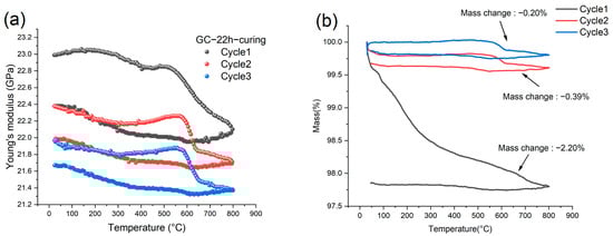 (a) The variation of Young’s modulus of a GC sample prepared by pyrolyzing 22-h-cured precursor in three thermal cycles with a heating rate of 5 °C/min and (b) Corresponding TGA results.