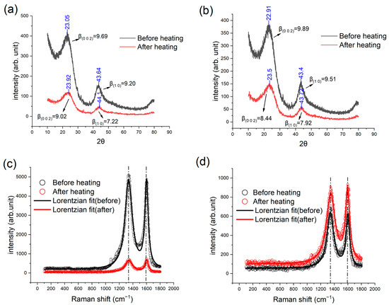 The XRD patterns exhibited two broad peaks at angles of 24° and 42°, corresponding to the reflection from the crystallographic plane of (0 0 2) and a turbostratic band (1 0) [6,43]. The structural characteristic peaks of diamond are due to (100), (220), (311), and (400) reflections, while those of graphite are mainly from (0 0 2) reflections. Unlike these two carbon allotropes, the characteristic peaks of glassy carbon are ascribed to the (1 0) and (002) reflections [44]. The microstructure of glassy carbon is formed by interlaced graphene layers. is the average stack thickness of graphene layers in the c-direction and can be determined from the FWHM of (0 0 2) peak. is the mean layer diameter in the a-direction and can be determined from the FWHM of (1 0) peak [14]. It is worth noting that the XRD results for both samples indicate a slight rightward shift of the two peaks after the heat treatment. Based on the Scherrer equation, , one can derive and , where K is the shape factor, the wavelength of X-ray, and the full width at half maximum (FWHM) of a peak [17]. It is found that the and reduce by 7.5% and 22.1%, respectively, after the heat treatment at 550 °C. For the heat treatment at 650 °C, the reductions in and are 4.3% and 6.8%, respectively. The position of the (0 0 2) reflection corresponds to the average spacing between carbon layers, , which can be determined based on the Bragg’s equation: [43]. Consequently, the rightward shift of the XRD peaks indicates a decrease in the spacing of atomic planes.