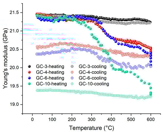 It is known that a heat treatment for GC can reduce or close internal micro-pores, contributing to an increase in elastic modulus [40]. Meanwhile, heating leads to thermal expansion and the anharmonicity results in a decrease in elastic modulus [41]. Therefore, the Young’s modulus of the bulk GC varies nonmonotonically with temperature, as demonstrated in Figure 8a, owing to the competition between the two mechanisms. In the first thermal cycle, the heating process lead to two humps in the modulus curve, which occurred in the temperature range of 100–200 °C and 500–600 °C, respectively. However, in the cooling process, these two humps vanished. In the second and third heating, the low-temperature (100–200 °C) hump also vanished. However, the high-temperature hump (500–600 °C) became much more significant than that of the first cycle. Notably, in pyrolyzing the precursor, the fastest density increase also occurred between 500 and 600 °C [32,42]. Hence, we conceive that the remarkable increase in the Young’s modulus of the GC sample can be correlated with the chemical process in this temperature range, for example, the remaining impurities in the GC sample may be driven away and carbon substructures may be more connected. It is noted that the most significant decrease in the Young’s modulus followed in the temperature range of 600–650 °C, suggesting a change in the crystalline structure in the temperature range of dehydrogenation during pyrolysis.