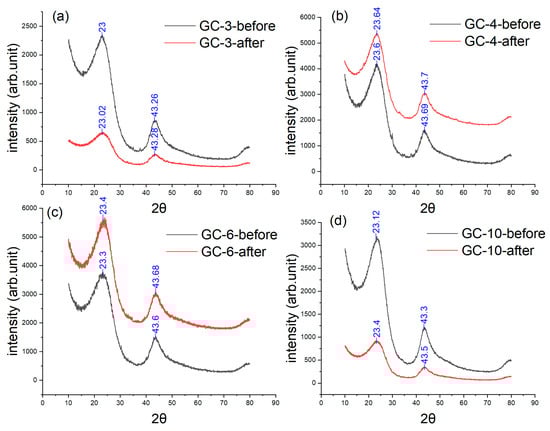 XRD results of four GC samples subject to different heating rates: (a) 3 °C/min, (b) 4 °C/min, (c) 6 °C/min, and (d) 10 °C/min.