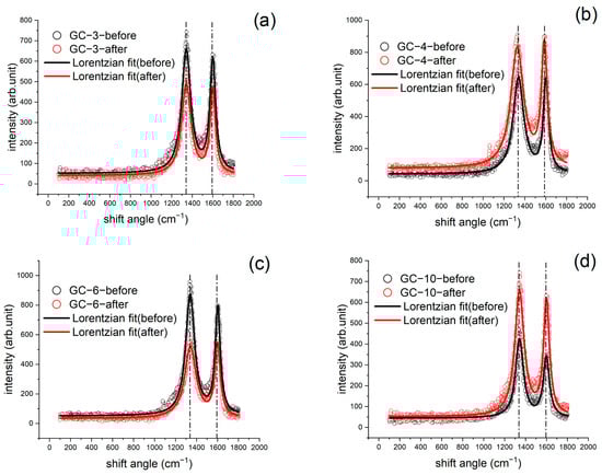Raman results of four GC samples subject to different heating rates: (a) 3 °C/min, (b) 4 °C/min, (c) 6 °C/min, and (d) 10 °C/min.