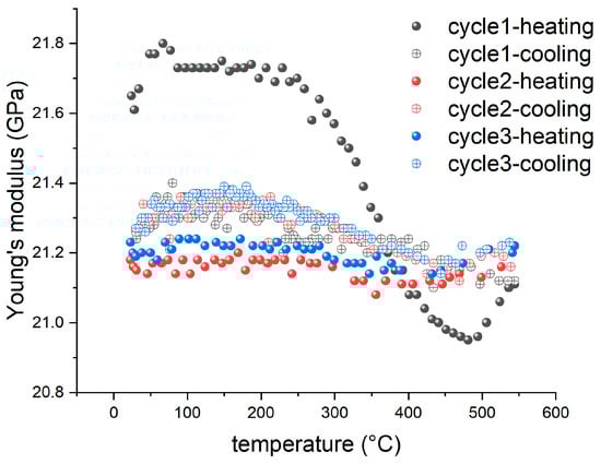Figure 8a shows a hump in the variation of Young’s modulus with temperature, which maximizes at approximately 550 °C. It is conceived that such an inherent structural change may be utilized to stabilize the stiffness of GC especially after it is damaged by a thermal shock. To validate this concept, a new GC sample was prepared from 22 h-cured resin. It was first heat treated based on the temperature profile of the sample GC-6 demonstrated in Figure 10. This sample was then reheated to 550 °C at a rate of 5 °C /min for three cycles, and the corresponding results are demonstrated in Figure 13. In the first cycle, a significant reduction in Young’s modulus before 500 °C occurs again, while the modulus rises between 500 and 550 °C, implying a restorative effect on stiffness. In the second and third cycles, the Young’s modulus becomes very stable, with a slight increase during cooling caused by the restorative effect between 500 and 550 °C.