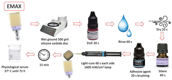 A lithium disilicate (IPS e.max CAD®) and two hybrid materials were evaluated: an NCR (Lava Ultimate®) and a PICN (VITA Enamic®). Each of them was bonded to a composite block using the cement selected by the manufacturer, and four test groups were formed: EMAX (IPS e.max CAD®), which was used as the control group; VE (VITA Enamic®); LUA (Lava Ultimate® with surface sandblasting); and LUS (Lava Ultimate® with surface silica coating).