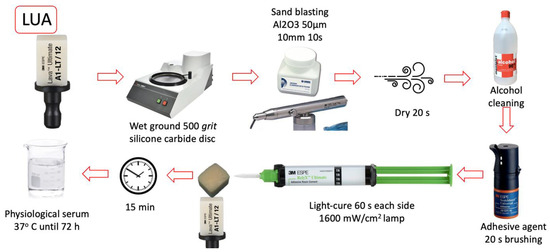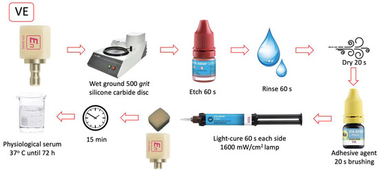 All bonding surfaces were polished with a 500-grit silicon carbide disc (Struers® LaboPol-1. Struers ApS, Ballerup, Denmark). The bonding of the restorative material to the composite blocks was performed according to each manufacturer’s protocol. The materials used in the study and the listed steps followed in the cementation sequence are shown in Table 1. (Figure 1, Figure 2, Figure 3 and Figure 4).
