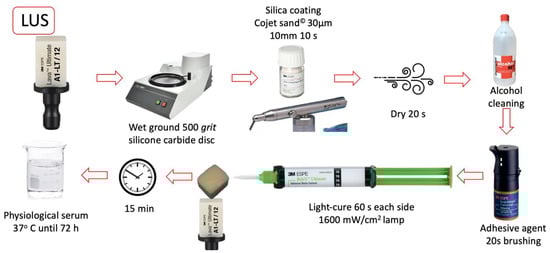 In the surface treatment of the nanoceramic resin, the manufacturer of Lava Ultimate® recommends either sandblasting or silica coating of the resin. Therefore, in this research, two groups were created to assess whether there were differences between the two. The values obtained by silica coating were slightly higher, although the difference was not significant. Sandblasting is normally used to increase the bonding surface of the restoration and thus improve adhesion. Depending on the particle size chosen for sandblasting, the surface roughness will be different, and the larger the particle size used, the more irregular the surface [29]. In this study, the manufacturer’s recommendations were followed, the LUA group was sandblasted with 50 µm aluminium oxide particles, and the LUS group was treated with 30 µm silica-coated aluminium oxide particles. By using the latter type of particles, the silica remains incorporated into the outermost layer of the material [16] and enables better ceramic-cement chemical bonding due to the bond between the silica, the silane, and the resin cement [30]. This could be the reason for a slightly better result in the silica-coated group.