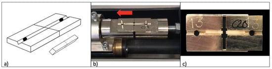 Microtensile test. (a) Schematic representation of a plate and a beam. (b) LMT100® machine before test. (c) Broken beam.