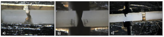The fractured beams were observed under light microscopy (10×) (Nikon® SMZ-10, Nikon, Tokyo, Japan), and the type of failure was classified as an adhesive (Figure 7b) or cohesive, from the restorative material (Figure 7a) or composite (Figure 7c).