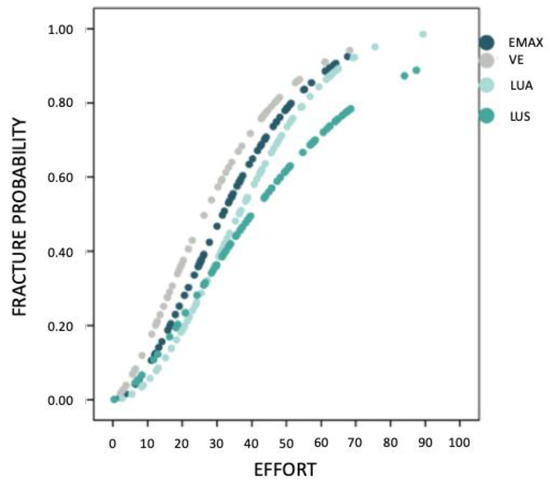 After the Weibull calculation and analysis, the fracture probability of the different groups was estimated, and a graphical representation of the probability curve as a function of stress was made to allow comparison between the different materials (Figure 8). The LUS group is shown to be the best of all, as its curve is the rightmost. In addition, its slope is the smoothest of the four, with the highest Weibull modulus (m) (10.76), which indicates that the stress must be increased considerably to achieve a significant increase in fracture probability.