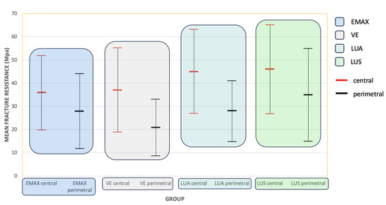 The bond strength averages are shown in Table 2. The group with the best mean value was LUS (42 ± 20 MPa), followed by LUA (38 ± 18 MPa). The group with the lowest values was VE (30 ± 17 MPa), and EMAX had values of 34 ± 16 MPa. The LUS group showed notable differences with both VE and EMAX, and the LUA group only showed appreciable differences with the VE group. The numerical variety in the N of each group was due to the complexity of the sample preparation and the fracture of some beams during the preparation.