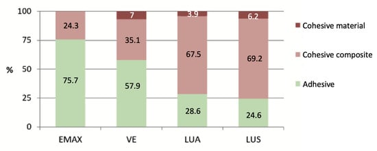 Adhesive fractures were predominant in both the EMAX and VE groups, while LUA and LUS had a majority of cohesive fractures. These results, together with the statistical analysis confirming that cohesive composite fractures were associated with significantly higher mean strength, lead to the conclusion that the bond strength of Lava Ultimate® is even higher since if the weak element, the composite, did not fail in the experiment, even better values would be obtained. Only the hybrid materials had cohesive failures, while the IPS e.max CAD® group, as expected, did not have any cohesive material failure since lithium disilicate is stronger than the hybrid restorative materials [31].