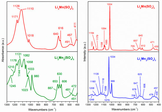 IR spectroscopy complemented by Raman scattering provides further characteristics on the structural peculiarities of L2M and L2M2 (Figure 2). In the region 1200–400 cm−1, the IR and Raman spectra are dominated by the vibration modes of SO4 groups, in accordance with our previous studies on kröhnkite, blödite, and alluaudite sulfate salts [10,48]. Between 900 and 1200 cm−1, the vibration spectra of SO4 groups display characteristic bands due to asymmetric and symmetric stretching modes (ν3 and ν1), while between 500–600 and 400–500 cm−1, the asymmetric and symmetric bending modes (ν4 and ν2) appear [49].