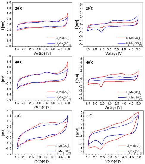 CV curves of L2M (red lines) and L2M2 (blue lines) at 20, 40, and 60 °C in electrolytes of 1 M LiPF6 in EC/DMC (left) and LiTFSI-Pyr1,3FSI (right). The scan rate is 50 mV/s.