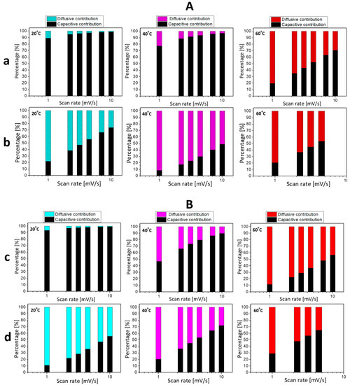 The contribution of capacitive and Faradaic (i.e., diffusive) reactions to the storage of Li by L2M (A) and L2M2 (B) in carbonate-based (a,c) and IL (b,d) electrolytes at 20 °C, 40 °C, and 60 °C.