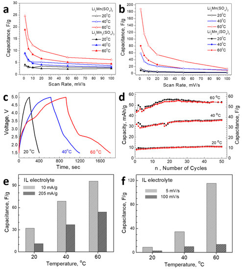 Capacitance (calculated from CV curves) delivered by L2M and L2M2 in carbonate-based (a) and IL (b) electrolytes. Charge-discharge curves of L2M cycled in IL electrolytes at 20, 40, and 60 °C (c). Cycling stability of L2M electrodes cycled in IL electrolytes at 20, 40, and 60 °C (d). In addition to the capacity (left Y scale), the corresponding capacitance is also given (right Y scale). The capacitance of L2M is determined from GCD at a current load of 10 and 205 mA/g as a function of operating temperature (e). The capacitance of L2M, determined from CV at a scan rate of 5 and 100 mV/s as a function of operating temperature (f). The IL electrolyte is used for (e,f) experiments.