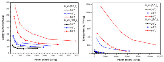 The Ragone plot for lithium-ion cells with L2M and L2M2 electrodes working in carbonate-based (left) and IL (right) electrolytes at room and elevated temperatures.