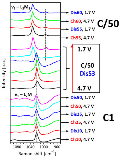 To rationalize the good electrochemical performance of L2M, in-situ Raman spectroscopy is undertaken. Because of the sensitivity of the ν1 mode of SO4 groups, the Raman spectra of L2M electrodes cycled between 5.0 V and 1.5 V in a carbonate-based electrolyte are shown in a wavelength range of 1100 and 950 cm−1 (Figure 8). Starting with a fast charging rate (i.e., a current load of 205 mA/g), the Raman spectra of charged and discharge electrodes show one band at 1024 cm−1 due to ν1-vibration of the SO4-group in the L2M structure. After 50 cycles, the current load is decreased from 205 to 4 mA/g, and the cell is cycled for the next 10 cycles while preserving the voltage range. At 53 cycles of discharging, the Raman is changed: the band at 1024 cm−1 is shifted to 1034 cm−1 concomitant with the appearance of a band at 995 cm−1. These SO4-modes correspond to the ν1 vibrations for L2M2, as shown in Figure 2. During cycling, another component appears as a shoulder at 1022 cm−1 (i.e., after 55 cycles of discharging). The next cycles do not provoke any further changes in the Raman spectra. This is an indication of a structural transformation of L2M into L2M2 during cycling. The in-situ-generated L2M2 is, most probably, responsible for the electrochemical performance.