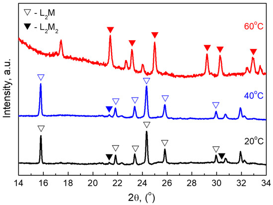 Furthermore, the phase transformation in L2M after cycling is monitored by ex-situ X-ray diffraction. Figure 9 collects the XRD patterns of L2M electrodes after 50 charge/discharge cycles at 20, 40, and 60 °C in IL electrolytes. The phase analysis of ex-situ XRD patterns reveals that L2M electrodes represent a mixture between L2M and L2M2 phases, whose ratio depends on the operating temperature: 80-to-20, 79-to-21, and 5-to-95% for the electrode cycled at 20, 40, and 60 °C, respectively. This means that at 60 °C, there is a nearly full phase transformation from L2M to L2M2 after cycling. This is an operating temperature where the L2M electrode performs best.