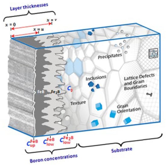 - Keddam, M.; Kulka, M. Simulation of the growth kinetics of FeB and Fe2B layers on AISI D2 steel by the integral method. Phys. Met. Metallogr. 2018, 119, 842–851. [Google Scholar] [CrossRef]
