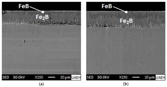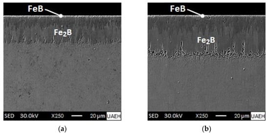 - Campos, I.; Ramírez, G.; Figueroa, U.; Martínez, J.; Morales, O. Evaluation of boron mobility on the phases FeB, Fe2B and diffusion zone in AISI 1045 and M2 steels. Appl. Surf. Sci. 2007, 253, 3469–3475. [Google Scholar] [CrossRef]