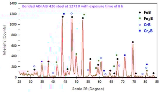 4.1. Microscopic Inspection of the Boride Coatings Formed on the Surface of the Ferrous Alloy