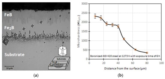- The surface hardness profile of AISI 420 stainless steel hardened by thermochemical boronizing treatment reached elevated hardnesses from about 1767 HV0.05 to 2250 HV0.05 at 40 μm from the surface and 345 HV0.05 in the core of the untreated material.