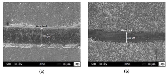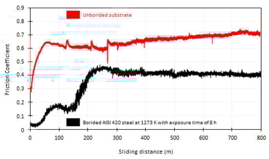 - The results of the pin-on-disc tests showed that the untreated specimen (AISI 420 stainless steel) showed greater predominantly adhesive wear. On the other hand, due to the presence of the boronized coatings (iron monoboride and diiron boride) and the dispersed carbides acting as solid lubricants, the width of the wear track was significantly reduced, improving the wear resistance considerably, as can be seen in Figure 14b. In addition, as the hardened surface (boronized surface) was sliding on a much softer surface, wear of an abrasive nature occurred.