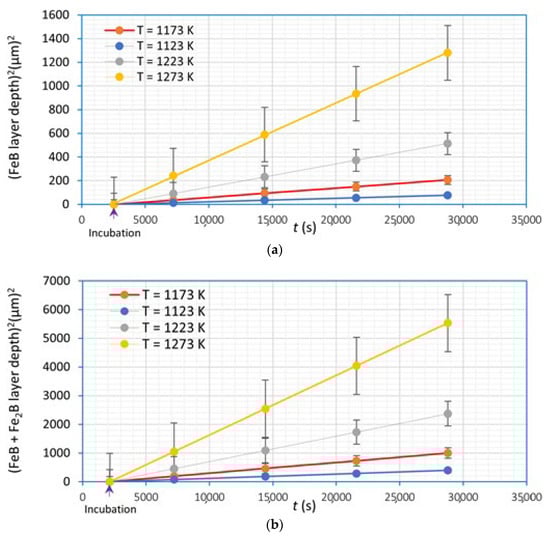 - Flores–Rentería, M.A.; Ortiz–Domínguez, M.; Keddam, M.; Damián–Mejía, O.; Elias–Espinosa, M.; Flores–González, M.A.; Medina–Moreno, S.A.; Cruz–Avilés, A.; Villanueva–Ibañez, M. A Simple kinetic model for the growth of Fe2B layers on AISI 1026 steel during the powder–pack boronizing. High Temp. Mater. Process. 2015, 34, 1–11. [Google Scholar] [CrossRef]