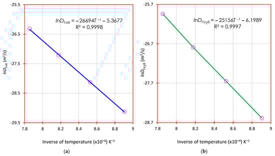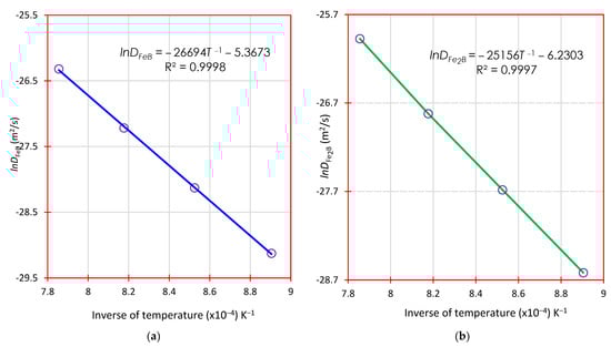 | Experimental Temperature T (K) | Boron Diffusivity in FeB (m2/s) | Boron Diffusivity in Fe2B (m2/s) |