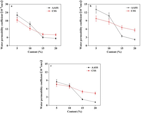Figure 3. The water permeability coefficients gradually decreased with increasing AAS and cement contents, indicating that both the two stabilization agents were effective in enhancing the water resistance of the soil. The water permeability coefficients of AASS were higher than those of CSS at dosages of 5 wt.% and 10 wt.%, and lower than those of CSS at dosages of 15 wt.% and 20 wt.% regardless of the curing ages. AAS glass mainly consists of calcium-rich and silicon-rich phases, and the former is the structure-forming body which maintains the structural stability of AAS glass. When the AAS comes into contact with water glass, the calcium-rich phases on the slag surface transform to Ca(OH)