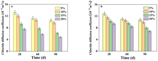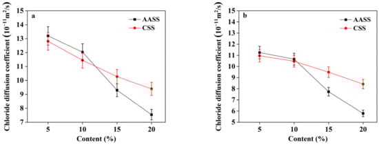 Figure 5 reveals that both cement and AAS were effective in decreasing the chloride migration coefficients. At dosages of 5 and 10 wt.%, there was no discernible difference between the chloride migration coefficients of CSS and AASS. For AASS samples, a more remarkable effect on chloride resistance was achieved at an AAS content of above 10 wt.%, reflected by a sharp decrease in migration coefficients. When the AAS content was increased from 10 wt.% to 15 wt.%, the 28 d, 60 d and 90 d migration coefficients were decreased by 37.3%, 45.7% and 50.3%, respectively (much higher than those of the CSS samples). This suggested that the solidifying effect of ASS became more significant with increasing dosages, leading to the densification of the soil matrix and thereby enhancing the chloride resistance.