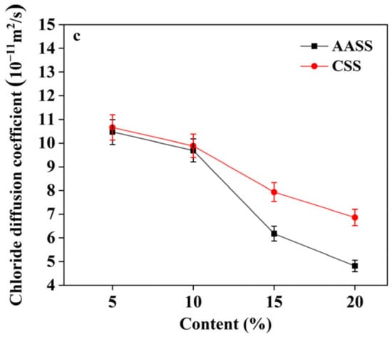 Figure 11b shows that the cumulative porosity of AASS20 decreased with increasing curing ages as a result of the latent hydraulic activity of AAS. The decreased porosity was responsible for the lower water and chloride permeability of AASS samples at a later age. The cumulative porosity of CSS at 90 d was 32.57%, which was much higher than the cumulative porosity of AASS at 90 days, which was 26.10%, further confirming that AAS was beneficial for later-age hydration.