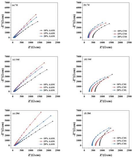 In contrast, the impedance of CSS increases as the amount of admixture increases. This is mainly owing to the fact that, when the cement admixture increases, the hydration reaction intensifies and the hydration products increase, causing a more obvious reduction in total porosity and a greater contribution to the impedance. The Nyquist diagram of CSS is always shifted to the right compared with that of AASS, and the impedance is relatively larger, proving that, during the preliminary hydration process, the products formed by cement hydration are more easily filled with soil porosity compared with those of AAS, resulting in relatively larger impedance.