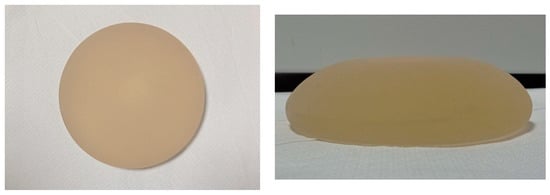 Following a similar procedure previously set up with different used prostheses [], squeezing tests were performed with new items. Two identical round prostheses of 275 cm3 volume (Figure 1) were compression tested between flat steel plates at a constant crosshead rate of 5 mm/min by an MTS858 Mini Bionix II (MTS Systems S.r.l., Torino, Italy) dynamometer. Compressive load, prostheses thickness and diameters were registered during the tests by a 15 kN load cell and video recording. The internal pressure was estimated as the ratio between load and contact area between prosthesis and compression plate. A first new, unaged item was pressed soon after the opening of the sterile, sealed packaging until rupture to estimate the rupture load and internal pressure. The second was pressed at 70% of the estimated failure load after aging at 37 °C in physiological saline solution (0.9%, NaCl). Results were determined for compression tests up to ten months of aging. Longer-term tests are underway.