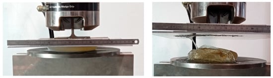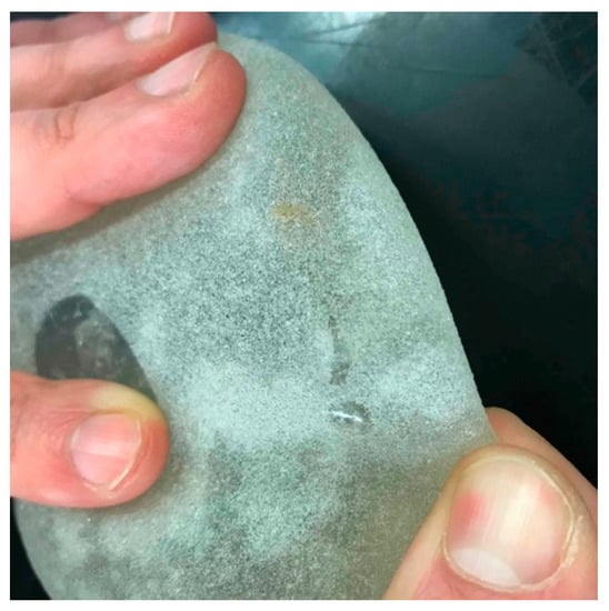 Figure 7 shows two frames from the video recordings of the seat/dummy during the crash tests: a relevant compression of the prosthesis was evident. A visual inspection after the impacts showed that at the lower speed, no clear damage of the prosthesis was observed; on the other hand, after impact at 90 km/h, a rupture with some, although limited, internal gel leakage was clearly evidenced (Figure 8). The limited loss after impact, compared to the extensive loss observed in compression tests (Figure 3), is related to the very short time of the crash event.