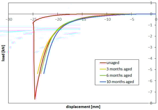Uniaxial compression load–displacement curves for new (up to failure) and aged prostheses.