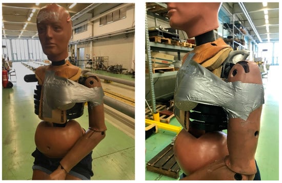 Assembly of prosthesis on Hybrid II dummy for crash tests.