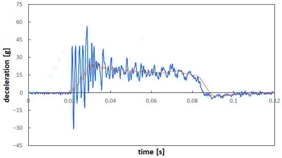 Deceleration vs. time of the crash event. Blue line: raw recording; red line: filtered results.