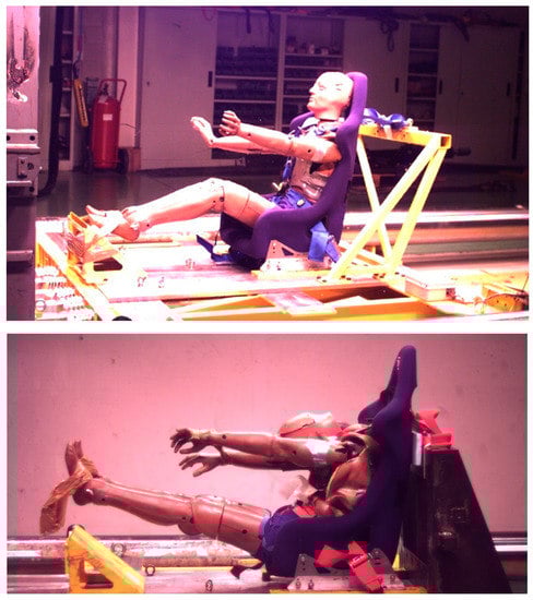 The recordings of the time history corresponding to the impact event for the two tests at 50 km/h and 90 km/h confirmed a maximum deceleration of about 25 g in both cases; this value is consistent with that experienced by a passenger in a vehicle during a frontal impact against a rigid barrier []. Figure 6 reports the deceleration vs. time results for the impact at 50 km/h; the blue line indicates the unfiltered signal from the accelerometer fixed on the sled, while the red line indicates the filtered result. It can be observed that after a peak corresponding to the onset of plastic deformation of the aluminum stopper, a fairly constant deceleration of about 20 g occurred during the whole pulse time. In case of impact at 90 km/h, as expected in consideration of the same stopper used, a quite similar deceleration peak was recorded, but with a longer pulse time.