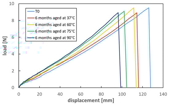 A further confirmation of the mechanical response trend with time comes from the results of the six-month aging for the specimens maintained at four different temperatures: tensile tests showed an evident increase of silicone stiffness with aging time, which becomes more relevant the higher the temperature. Table 2 reports the strength and strain at failure values after six-month aging, while Figure 10 shows tensile load vs. displacement curves of aged silicone samples compared to unaged material.