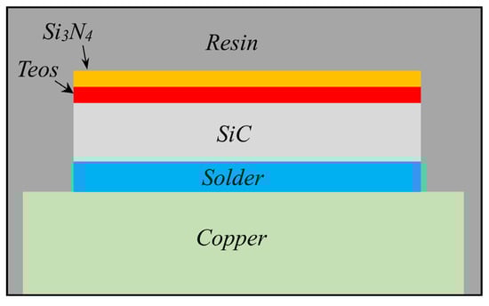 The material properties of each layer, as presented in Table 1, are taken from the literature [27,28,29,30,31,32]. The overall size of the package (encapsulating resin) is supposed to be 14.5 mm by 10 mm in the reference x–y plane, with a thickness along the z direction of 5 mm. The representative die has an outer square contour of 3.6 mm and the thicknesses of its layers range from the order of magnitude of 1 µm for the Si3N4 and the TEOS, to nearly 50 µm for the solder, to nearly 200 µm for the SiC.